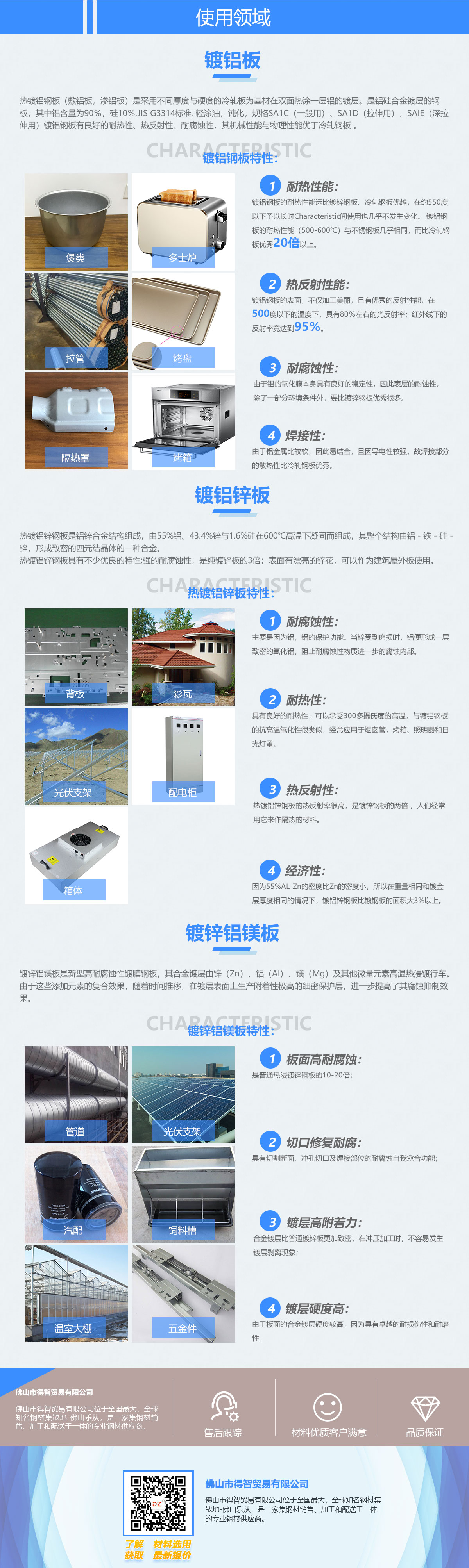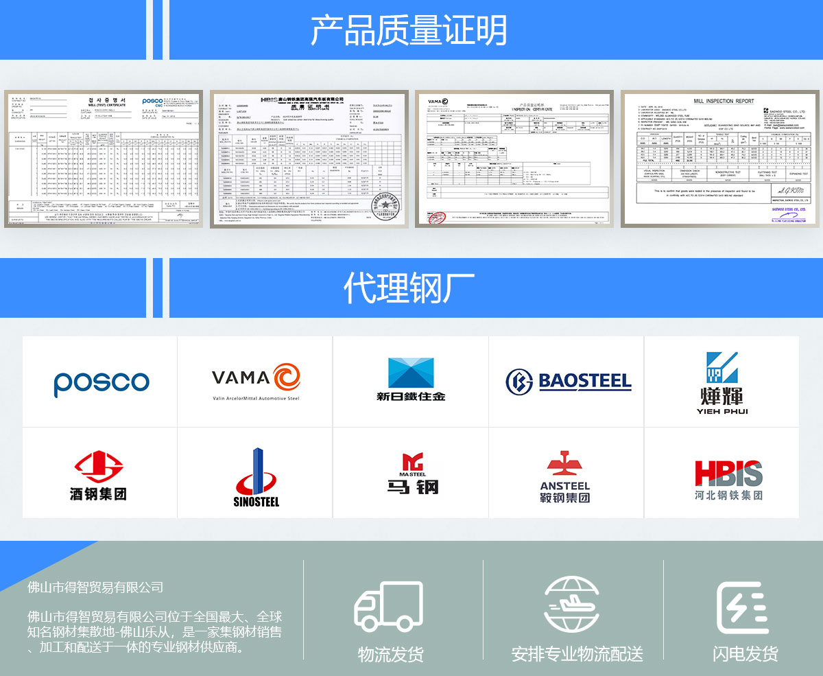 您好!我們是佛山市得智貿(mào)易有限公司,位于佛山樂從—全國最大,全球知名的鋼材集散地!我們長年供應(yīng)進口及國產(chǎn)鍍鋁鋼板、鍍鋁鋅板、鍍鋅鋁鎂板、高鍍層鍍鋅板等等,是韓國浦項、華菱安賽樂、寶鋼、鞍鋼蒂森以及攀鋼、酒鋼各大品牌的重要代理商。